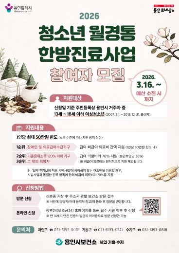 용인특례시(시장 이상일)는 청소년들의 건강한 성장을 돕기 위해 ‘청소년 월경통 한방진료 지원사업’을 실시한다고 10일 밝혔다.